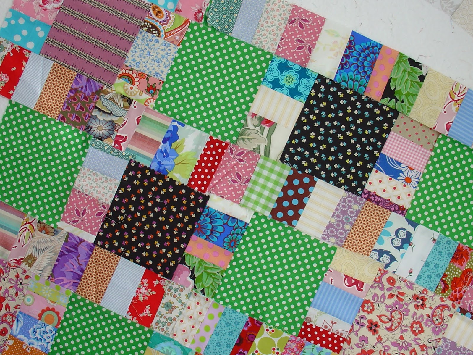 I was hoping to get a few ideas about patterns & fabrics for the workshop, but instead I came across a quilt that I remembered starting ages ago, Greenfields. I had no pattern back then, just a photo in an old quilting magazine, a bunch of 5" Denyse Schmidt charm squares and just over a metre of bright fabric, a Kelly Green spot. I had jumped right in making up heaps of scrappy strips. Then it all got put away for a rainy day!